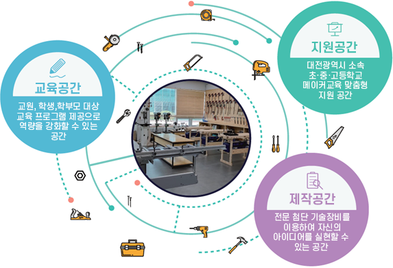 | 레이저 및 CNC 가공실 | 목재 가공실 | 자재실 및 집진실 |